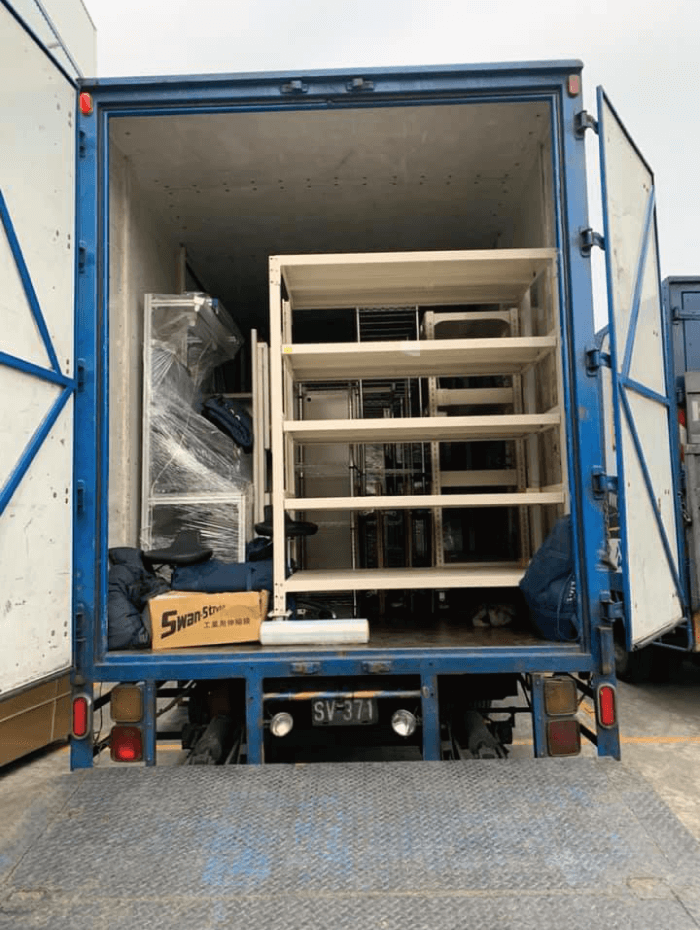 首先我們先將廠房內各個部門的紙箱、機器、電腦分批放置各台搬家貨車上,避免之後在放置物品時會有放錯部門的狀況。